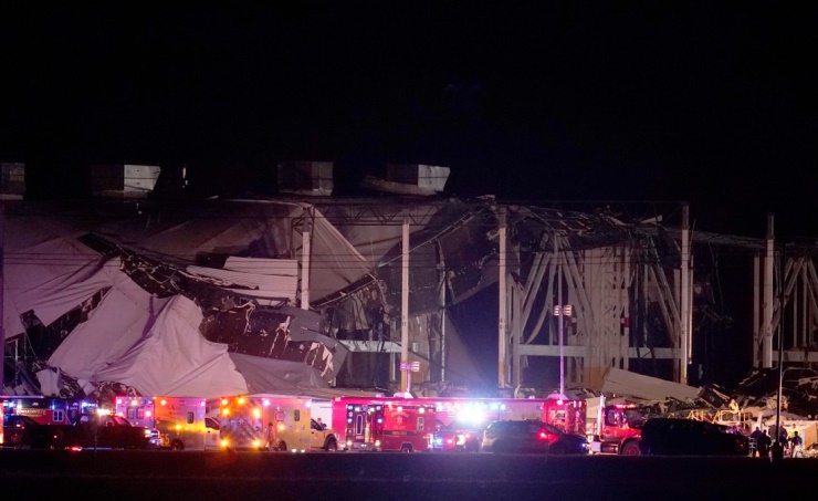 Footage from St. Louis TV stations showed dozens of emergency vehicles at the Amazon center near Edwardsville, Illinois, about 25 miles west of St. Louis. It wasn’t immediately clear if or how many people were hurt, but the Collinsville, Illinois, Emergency Management Agency on Facebook called it a “mass casualty incident.” One official told KTVI-TV that up to 100 people were believed to be in the building, working the night shift, at the time of the collapse.
