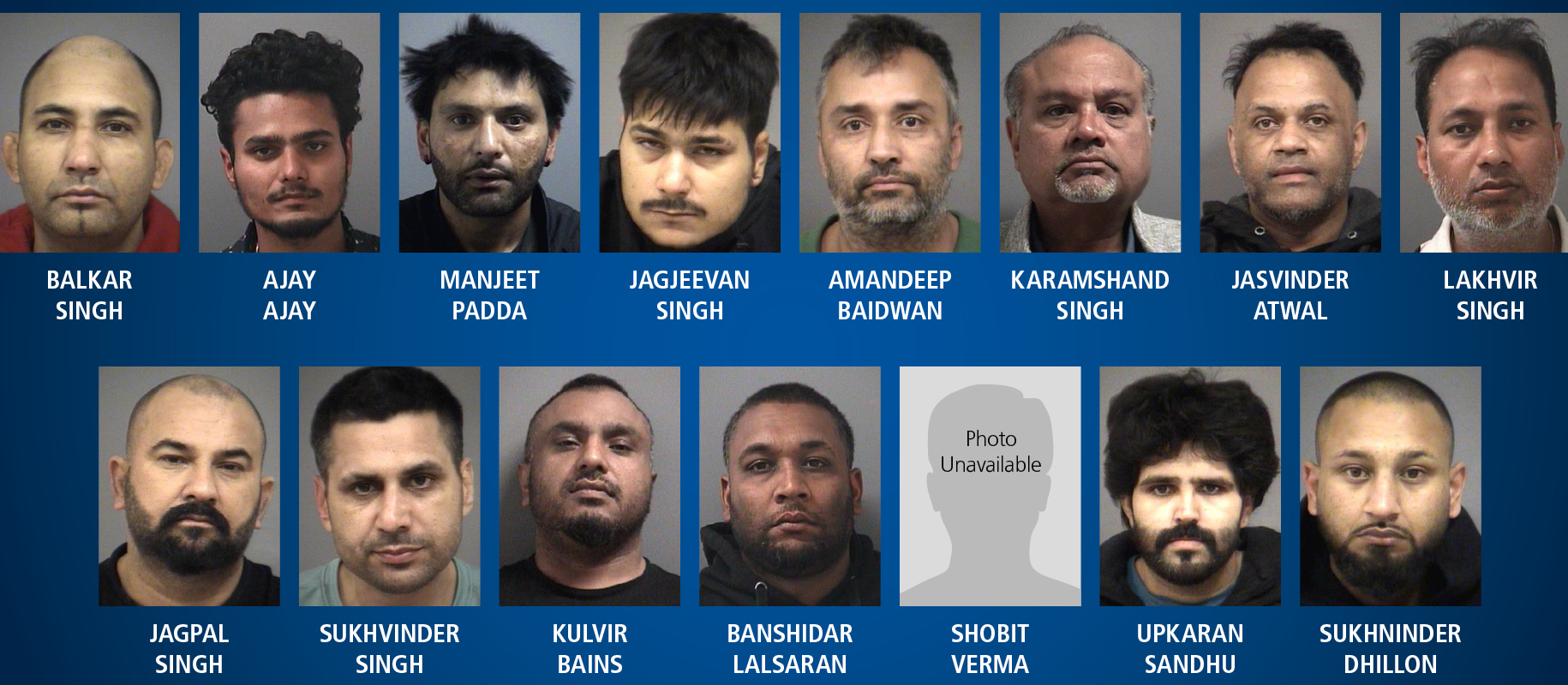 Police have recovered 28 stolen tractor-trailers and seized 28 containers of stolen cargo from the 15 accused identified as Balkar Singh (42), Ajay (26), Manjeet Padda (40), Jagjeevan Singh (25), Amandeep Baidwan (41), Karamshand Singh (58), Jasvinder Atwal (45), Lakhvir Singh (45), Jagpal Singh (34), Upkaran Sandhu (31), Sukhvinder Singh (44), Kulvir Bains (39), Banishidar Lalsaran (39), Shobit Verma (23), and Sukhninder Dhillon (34).