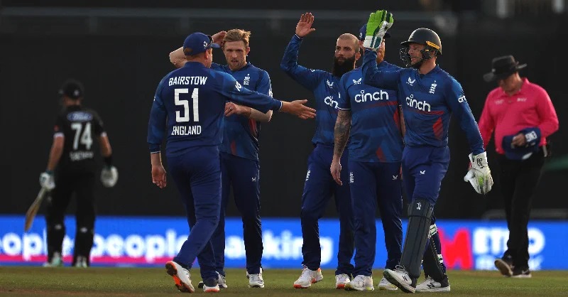In their reply, New Zealand lost opener Finn Allen for zero, bowled by David Willey off the second ball of the innings and though Devon Conway and Will Young took them to 49 in the ninth over, they continued to lose wickets at regular intervals.