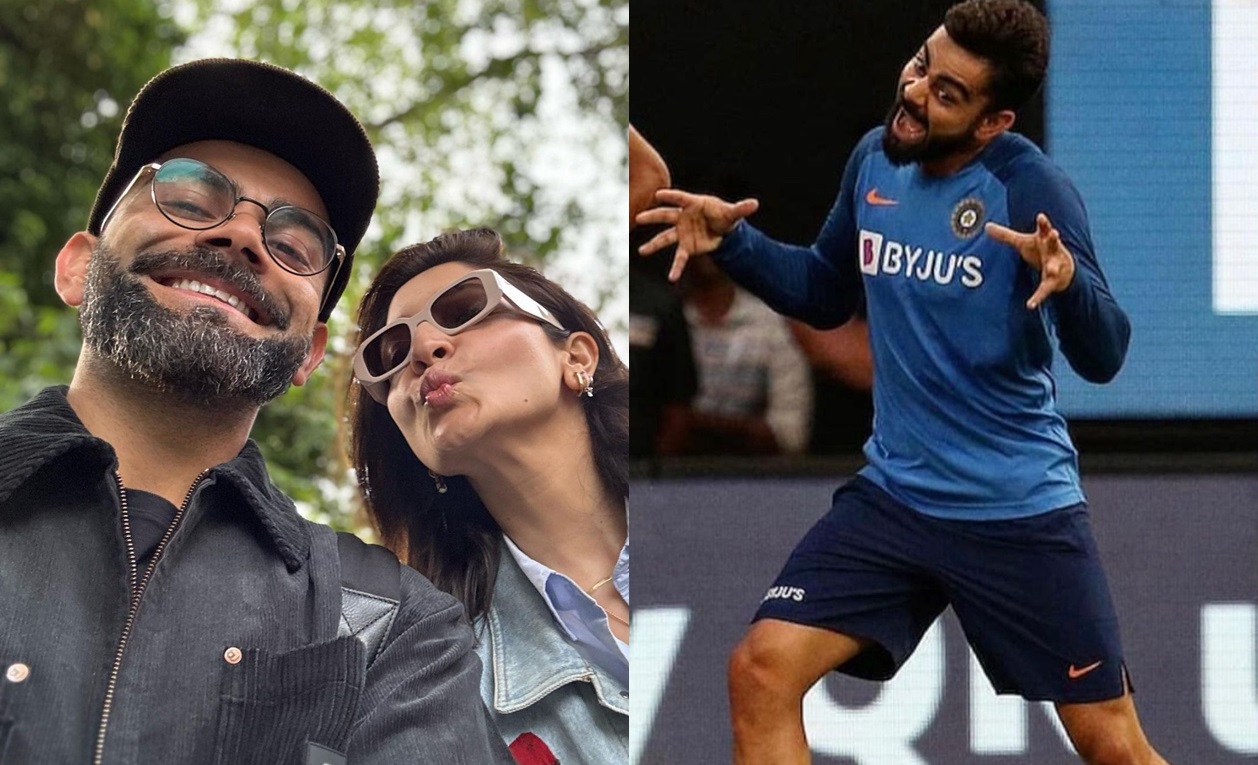 The second picture features Virat in his cricket practice jersey, posing in a candid and quirky manner.