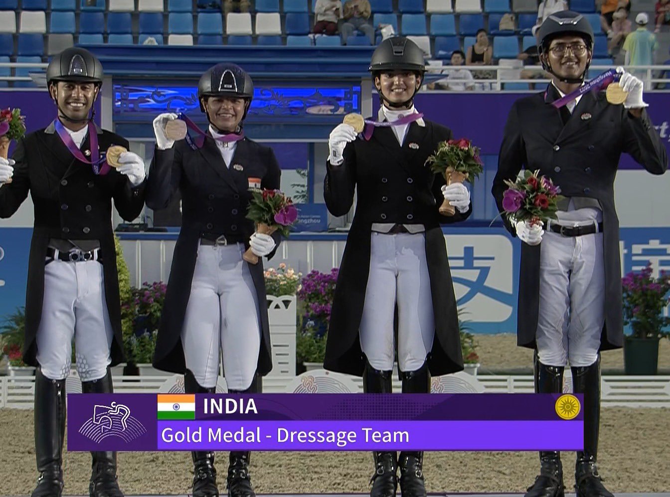 The Indian team of Sudipti (up on Chinski), Divyakriti (Adrenalin Firfod), Hriday (Chemxpro Emerald) and Anush (on Etro) scored 209.206 percentage points to finish ahead of hosts China, who scored 204.882. Hong Kong China won the bronze medal with a score of 204.852.