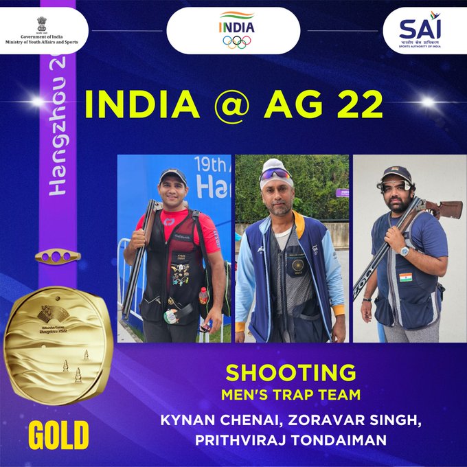 The Men’s Trap team of Kynan Chenai, Zoravar Singh Sandhu and Prithviraj Todaiman bagged the gold medal with a Games Record score of 318 as it finished ahead of Kuwait and China, who took silver and bronze medals with scores of 358 and 354 respectively.