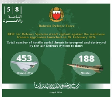 Manama : The General Command of the Bahrain Defence Force announced that through the unwavering vigilance of its personnel, the BDF’s air defence systems continue to successfully counter successive waves of the hostile terrorist Iranian aggression. Since the onset of hostilities, air defences have intercepted and destroyed 188 ballistic missiles and 453 drones targeting the Kingdom of Bahrain.