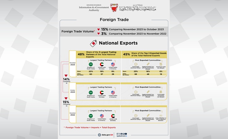 Manama : The Information &eGovernment Authority (iGA) has published its Foreign Trade report of November 2023, which encompasses data on Trade Balance, Imports, Exports of products with national origin, and Re-exports.