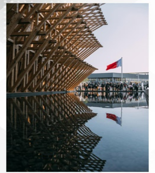 Located in the “Empowering Lives” zone, the 995-square-metre pavilion stands four storeys high with sea views. Designed by Lina Ghotmeh, it is built mainly from wood and cooled naturally by sea breezes, making it one of the most sustainable structures at the expo.