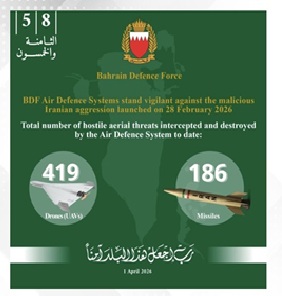Manama : The General Command of the Bahrain Defence Force announced that through the unwavering vigilance of its personnel, the BDF’s air defence systems continue to successfully counter successive waves of the hostile terrorist Iranian aggression. Since the onset of hostilities, air defences have intercepted and destroyed 186 ballistic missiles and 419 drones targeting the Kingdom of Bahrain.