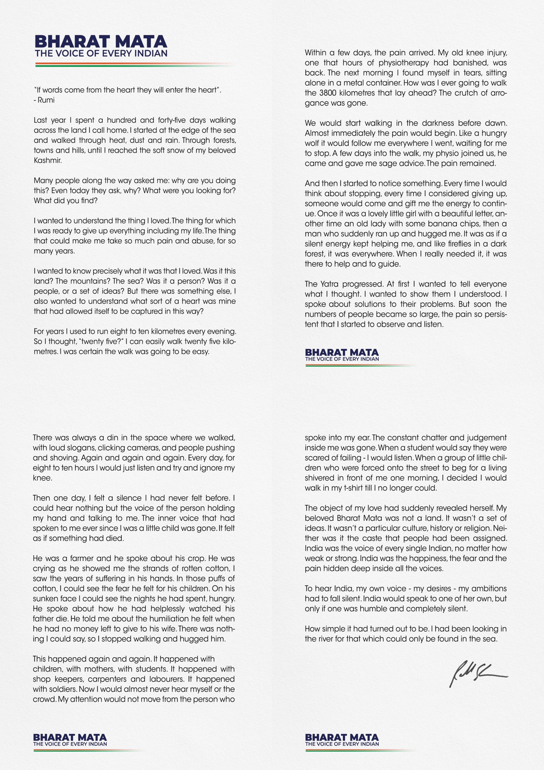 “My beloved Bharat Mata was not a land. It wasn’t a set of ideas. It wasn’t a particular culture, history or religion. Neither was it the caste that people had been assigned. India was the voice of every single Indian, no matter how weak or strong. India was the happiness, the fear and the pain hidden deep inside all the voices,” he said in the video.