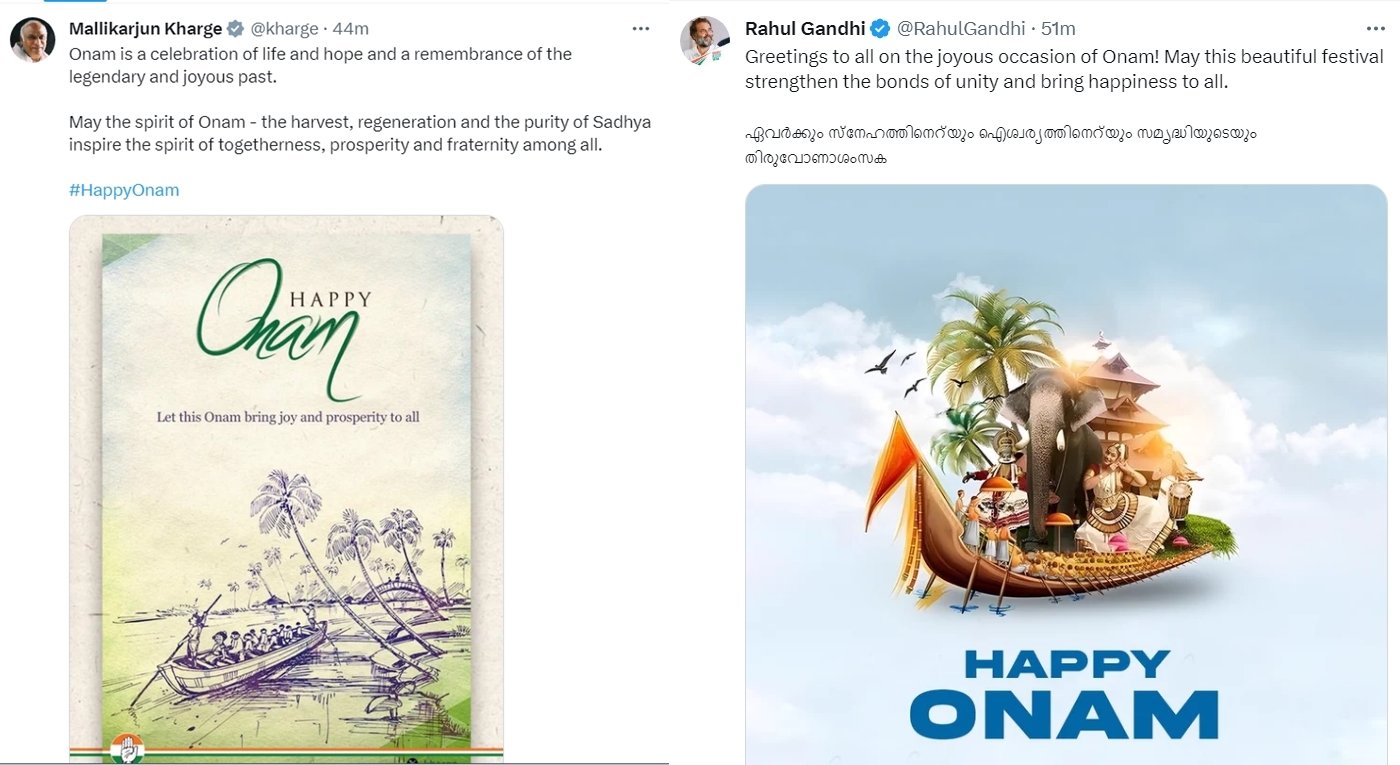 Kharge in a tweet said, “Onam is a celebration of life and hope and a remembrance of the legendary and joyous past. May the spirit of Onam – the harvest, regeneration and the purity of Sadhya inspire the spirit of togetherness, prosperity and fraternity among all.”