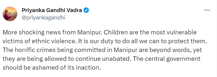In a post on X, formerly Twitter, Priyanka Gandhi said, “More shocking news from Manipur. Children are the most vulnerable victims of ethnic violence. It is our duty to do all we can to protect them.”