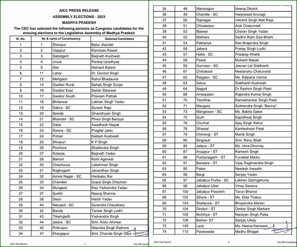 The Congress in its first list announced 144 candidates for the 230-member Madhya Pradesh Assembly, fielding former Chief Minister and state unit chief Kamal Nath from Chhindwara Assembly seat, Dr Govind Singh from Lahar Assembly seat, Digvijaya’s Singh son Jaivardhan Singh from Raghogarh Assembly seat.