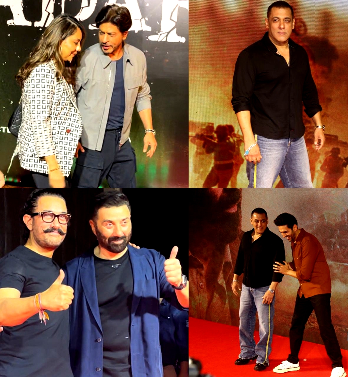 We can see Sunny Deol putting his arm around SRK’s shoulder, and the two walked and posed for the cameras. Sunny was wearing a black tee shirt and blue blazer and matching pants.