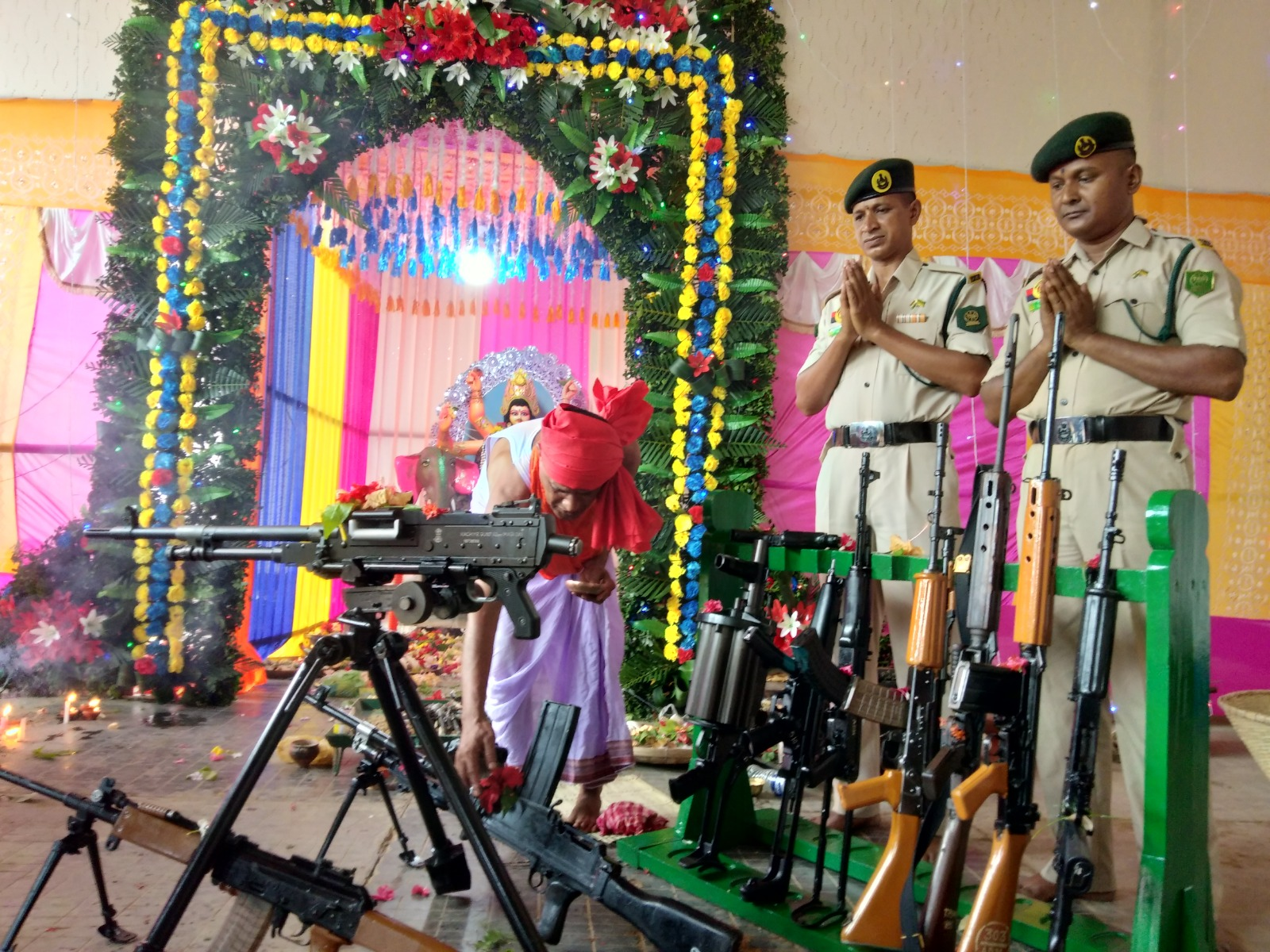 On Monday, troopers of the TSR reverently placed their arms and ammunition before Lord Vishwakarma, the Hindu god of architecture and engineering.