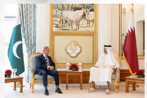 Doha : His Highness Sheikh Tamim bin Hamad Al-Thani, Amir of the State of Qatar and His Excellency Muhammad Shehbaz Sharif, Prime Minister of the Islamic Republic of Pakistan, discussed the latest regional and international developments, particularly those in the Middle East, during a meeting today.