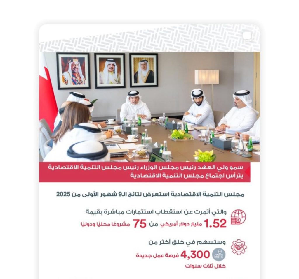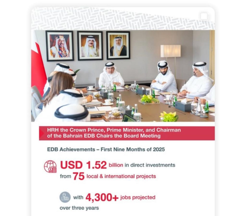 The Board reviewed the Bahrain EDB’s progress and assessed global market developments. Discussions covered global economic trends and strategies to attract investment across priority sectors, supporting growth and diversification.