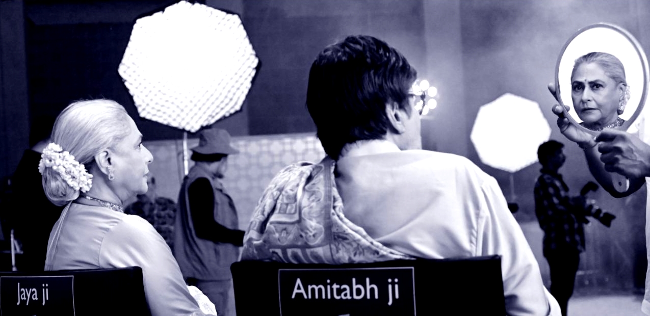 Big B took to his blog, where he shared a monochrome picture. In the image, their back is facing the camera and it seems the two are getting ready for the shot. The advertisement seems to be for a jewelry brand as the chairs they are sitting on have their names and the brand mentioned.