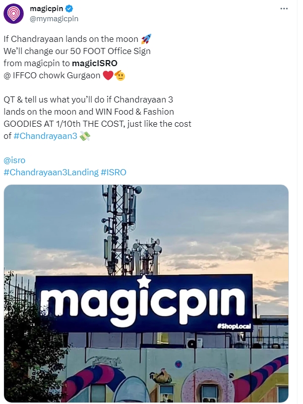 “If Chandrayaan lands on the moon we’ll change our 50 FOOT Office Sign from magicpin to magicISRO @ IFFCO chowk Gurgaon. QT & tell us what you’ll do if Chandrayaan 3 lands on the moon and WIN Food & Fashion GOODIES AT 1/10th THE COST, just like the cost of #Chandrayaan3,” magicpin posted in X (formerly Twitter) on Wednesday.