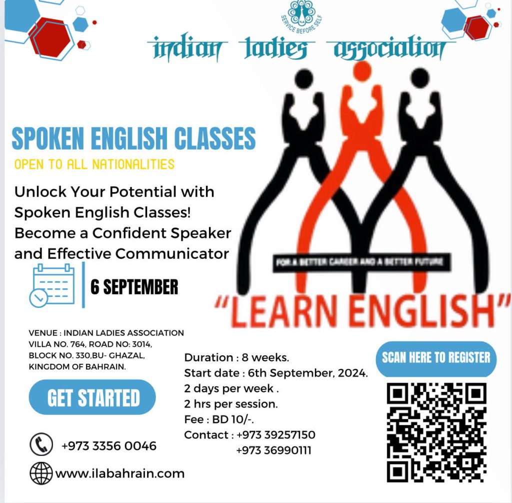 The Indian Ladies Association (ILA) announces the commencement of its annual classes for basic communication skills in spoken English in September 2024, specifically designed for low-income adults of all nationalities residing in the Kingdom of Bahrain. This course targets individuals who cannot afford expensive training institutions. The course is one of ILA’s many community outreach projects and is coordinated by the SpeakEasy subcommittee members Dr. Ruby Thomas and Nisha Maroli.