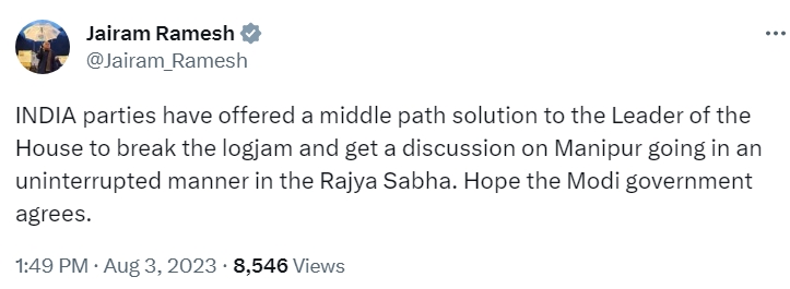 In a tweet on Thursday, Congress general secretary Jairam Ramesh said, “INDIA parties have offered a middle path solution to the Leader of the House (Piyush Goyal) to break the logjam and get a discussion on Manipur going in an uninterrupted manner in the Rajya Sabha. Hope the Modi government agrees.”