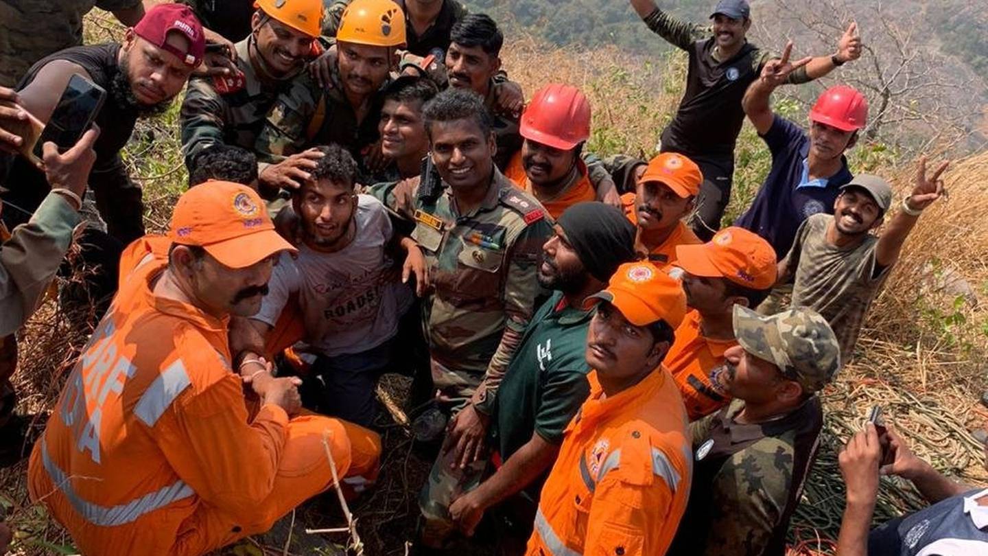 Indian Army drone footage showed the moment Mr Babu emerged safely with the aid of a rope as rescue teams cheered him.