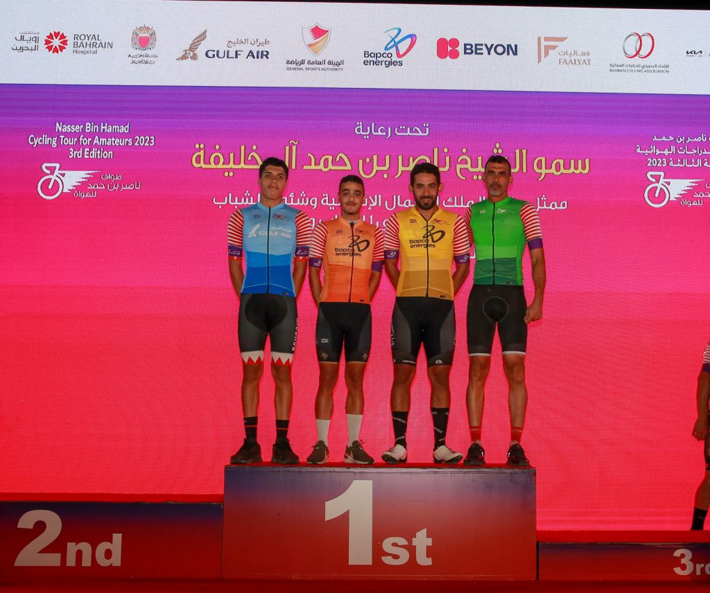 Regarding the jerseys for Bahrainis, Abdullah Ali secured the yellow and red jerseys, Hassan Aqeel claimed the blue jersey for the U23 category, and Aqeel Abdul Amir won the jersey for the over 40 category.