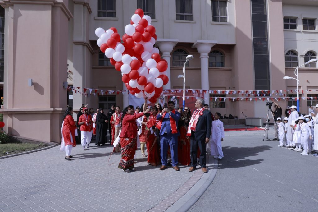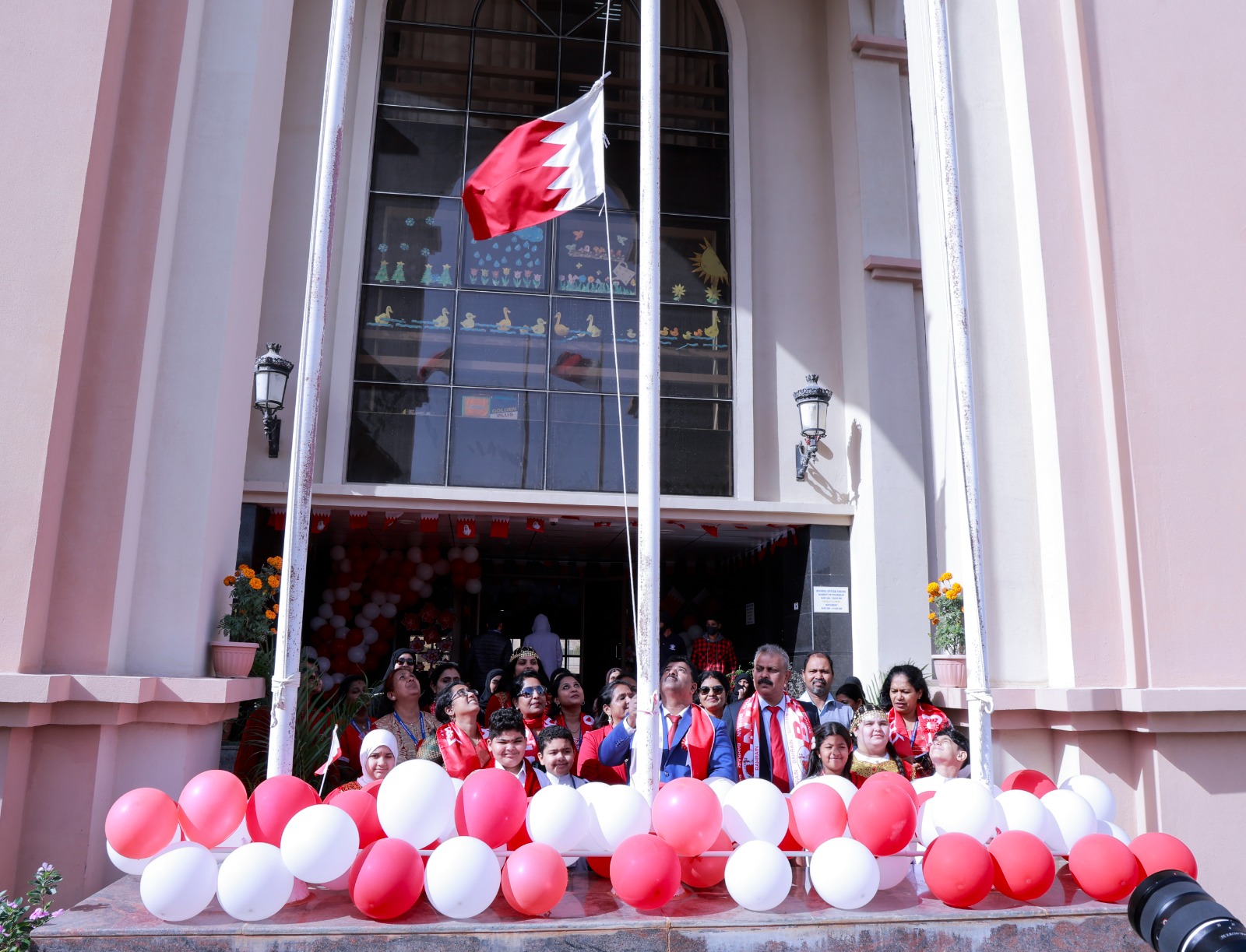 The day kicked off with a unified rendition of the national anthem, followed by the recitation of the Holy Quran. The highlight of the ceremony was the flag hoisting, attended by prominent dignitaries including Hon. Secretary V. Rajapandian, Hon. Asst. Secretary & Member-Academics Ranjini Mohan, Hon. EC Member Biju George, Junior Wing Principal Pamela Xavier, and Vice-Principal Priya Laji, along with students, parents, and staff. In a symbolic gesture, 53 red and white balloons were released to mark the 53rd National Day of Bahrain.