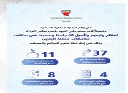 Furthermore, work is currently underway to finalise the opening, renovation, and maintenance of the following mosques: Asma Abdulraheem Zainal Al Bastaki Jami’ (Hajiyat), Al Tuwainiya Mosque (Sitra), Imam Al Redha Mosque (Salman City), Nasser Al Haq Mosque (Arad), Shaikh Nasser Mosque (Al Koura), Al Darawish Mosque (Jidhafs), Bahman Mosque (Hamad Town), and Shaikh Sahlan Mosque (Al Eker).