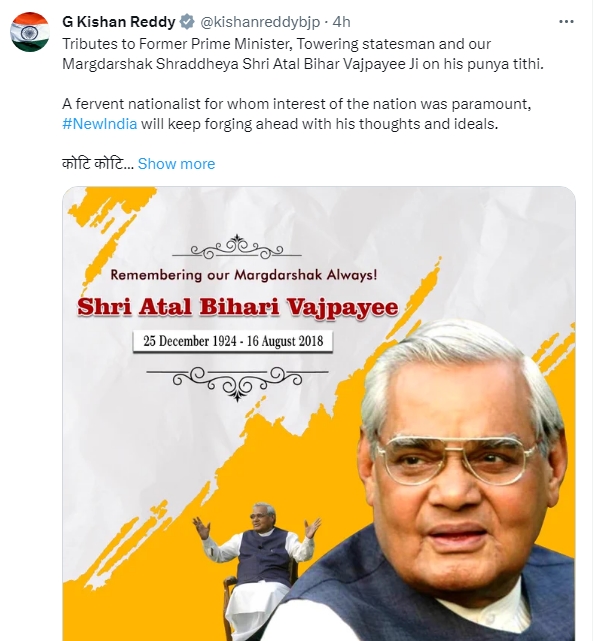 “Tributes to Former Prime Minister, Towering statesman and our Margdarshak Shraddheya Atal Bihari Vajpayee Ji on his punya tithi,” Reddy wrote on X, formerly Twitter.