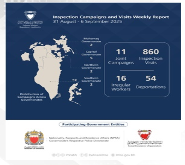 Manama : The Labour Market Regulatory Authority (LMRA) announced the implementation of 871 inspection campaigns and visits, during the period of August 31 to September 6, which resulted in the detention of 16 violating and irregular workers, while 54 violators were deported.