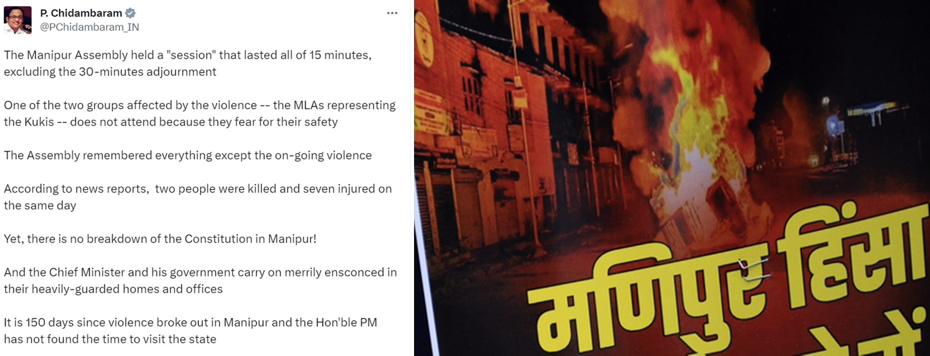 In a tweet, Chidambaram said: “The Manipur Assembly held a ‘session’ that lasted all of 15 minutes, excluding the 30-minutes adjournment. One of the two groups affected by the violence — the MLAs representing the Kukis — does not attend because they fear for their safety.