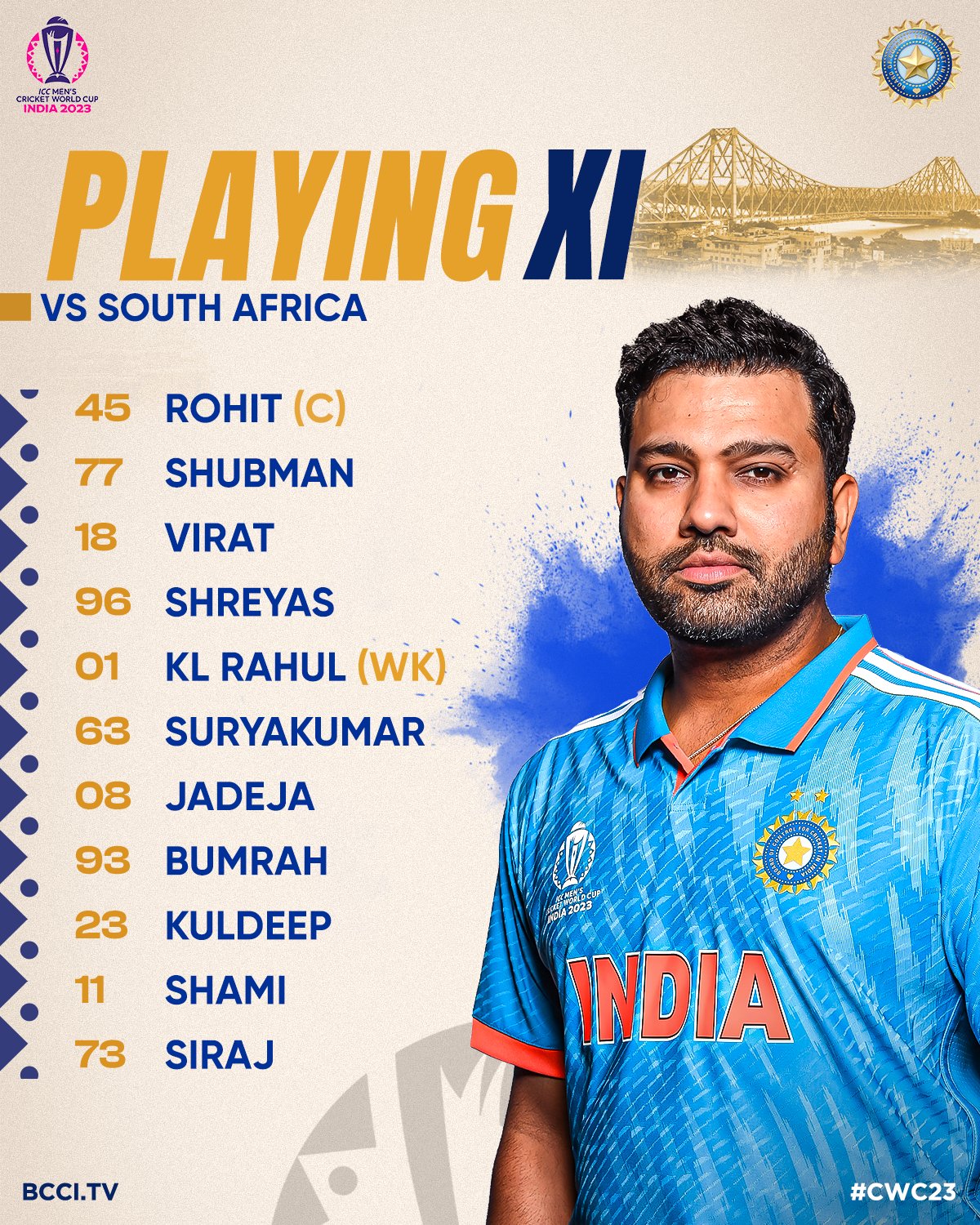 India:Rohit Sharma(c), Shubman Gill, Virat Kohli, Shreyas Iyer, KL Rahul(w), Suryakumar Yadav, Ravindra Jadeja, Mohammed Shami, Jasprit Bumrah, Kuldeep Yadav, Mohammed Siraj