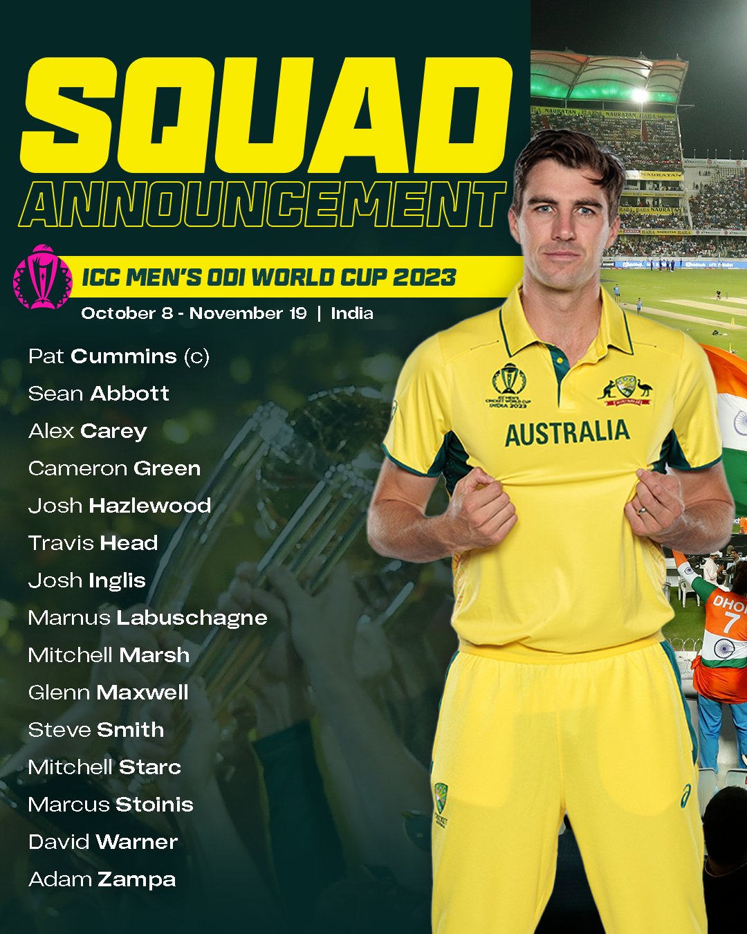 Australia World Cup squad: Pat Cummins (c), Sean Abbott, Alex Carey (wk), Cameron Green, Josh Hazlewood, Travis Head, Josh Inglis, Marnus Labuschagne, Mitchell Marsh, Glenn Maxwell, Steve Smith, Mitchell Starc, Marcus Stoinis, David Warner, Adam Zampa