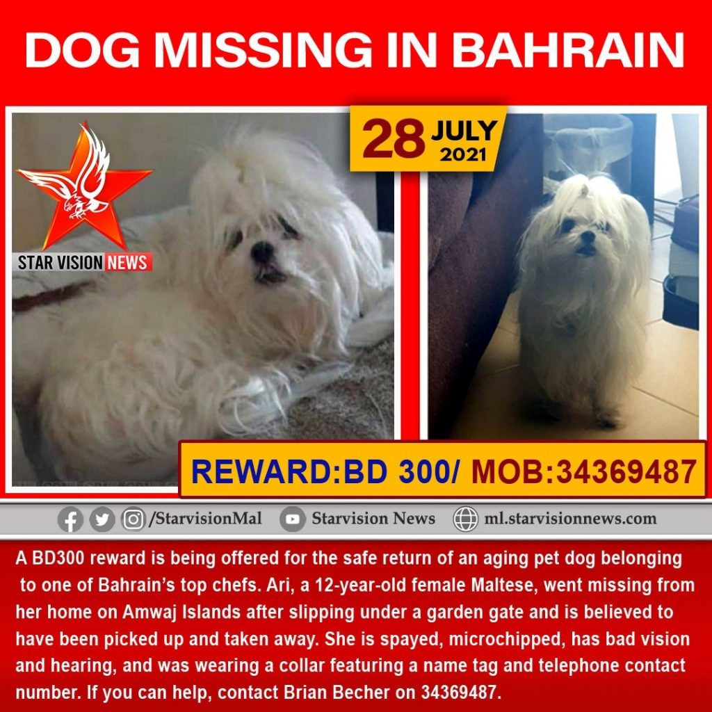 Aric, 12 Yrs. Old , female Maltese went missing from her home in Amwaj Island neighborhood behind the Day & Night Market on Tuesday 8:45pm July 27, 2021.