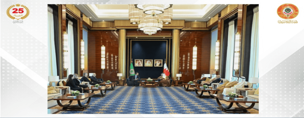 HH Shaikh Isa bin Abdullah bin Hamad Al Khalifa, Dr. Shaikh Abdullah bin Ahmed bin Abdullah Al Khalifa, Political Affairs Undersecretary at the Ministry of Foreign Affairs, Ambassador Ahmed Rashid Khattabi, Assistant Secretary General and Head of the Media and Communication Sector at the Arab League, and Ambassador Waheed Mubarak Sayyar, Head of the Mission of Honour, were present.
