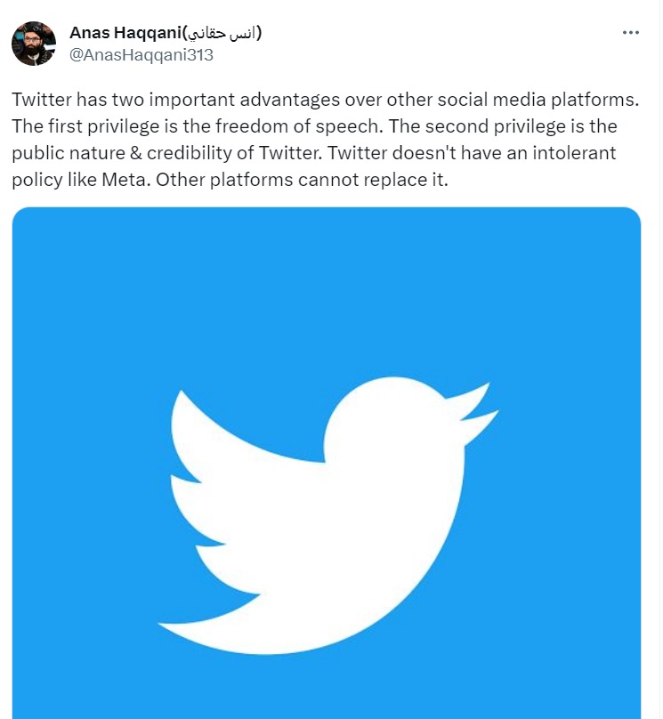 Anas Haqqani, a Taliban thought-leader with family connections to the leadership, officially endorsed Twitter over Meta’s Threads that has crossed 100 million users within a week of its launch.