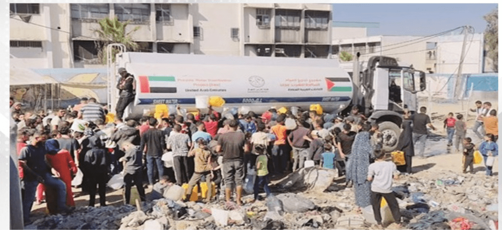 Abu Dhabi : The UAE’s “Operation Gallant Knight 3” distributed urgent aid, including dates and drinking water, to displaced Palestinian families in Khan Yunis. The operation aims to provide immediate relief amid severe water shortages due to infrastructure damage.