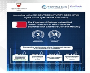 Manama : Bahrain has been ranked second regionally and 15th globally among 197 countries on the World Bank Group’s 2025 GovTech Maturity Index (GTMI), a milestone achievement. The report classified Bahrain in Category A among countries with a “very high digital maturity”. The Kingdom recorded an overall maturity rate of 93.6% in 2025, compared to 51% in 2020, which subsequently rose to 83% in 2022. This year’s record results reflect the country’s remarkable progress in consolidating its position as a regional leader in eGovernment services and building a comprehensive system to encourage innovation.